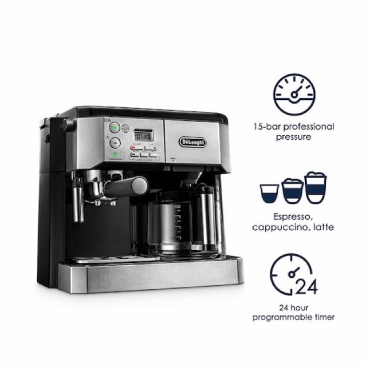 مجهز به تایمر قابل برنامه ریزی ۲۴ ساعته امکان تهیه ۱۰ فنجان قهوه فرانسه دارای سیستم رسوب زدایی امکان تهیه همزمان اسپرسو و قهوه فرانسه (دو مخزن جداگانه)
